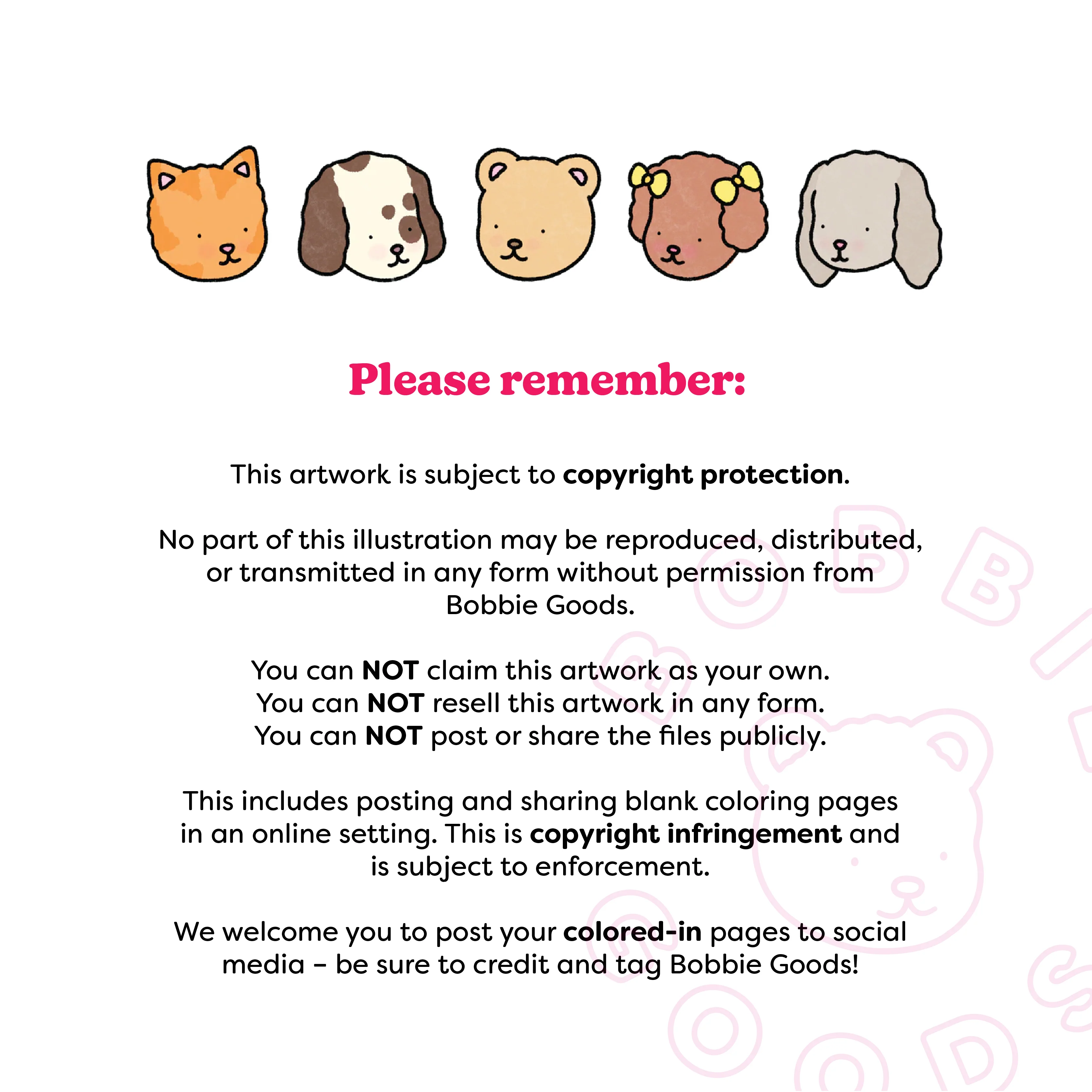 • PLEASE READ COPYRIGHT INFORMATION! You can NOT resell or repost coloring pages. Be sure to credit and tag Bobbie Goods if you post your coloring to any social media site. *you may only post colored-in pages!